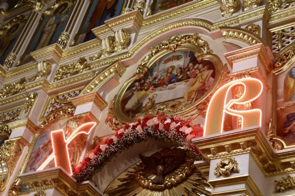Богослужение в Воскресенском храме прошло по-настоящему торжественно. Красные пасхальные облачения духовенства, дорогие сердцу каждого православного верующего буквы «ХВ» над алтарем, звучавшие с какой-то особенной силой пасхальные возгласы и песнопения — все в этот вечер возвещало о большом празднике.